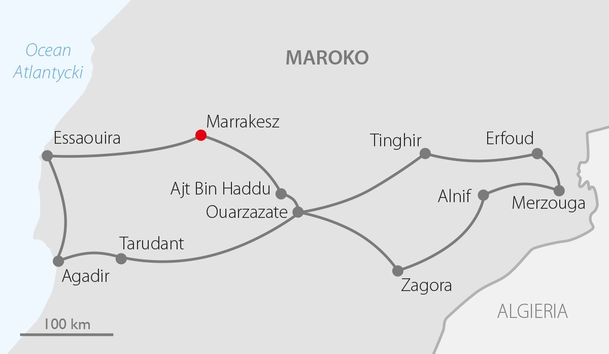 Śniadanie. Wykwaterowanie. Przejazd przez góry Atlasu Wysokiego malowniczą przełęczą Tizi-n-Tichka na wysokości ponad 2260 m n.p.m. do najsłynniejszego marokańskiego ksaru AJT BIN HADDU na skraju rzecznej doliny, gdzie znajduje się potężna, najpiękniejsza w całym Maroku, ufortyfikowana wioska berberyjska w kolorze ochry, wpisana na listę UNESCO. Malowniczość tego miejsca sprawiła, że kręcono tu wiele filmów, m.in. „Gladiatora”, „Lawrence’a z Arabii” czy „Klejnot Nilu”. Przejazd w kierunku OUARZAZATE. Zwiedzanie Studiów Filmowych „Atlas” (Atlas Film Corporations Studio), których murów bronią olbrzymie, stylizowane na egipskie figury. Studia rozciągają się na 30 tys. m² pustynnego pejzażu, to tutaj nakręcono setki filmów. Obiad w lokalnej restauracji. Po południu przejazd malowniczą trasą wzdłuż rzeki Draa, wśród oaz i kazb, do ZAGORY. Podczas przejazdu spacer po gaju palmowym. Zakwaterowanie w hotelu, kolacja i nocleg.