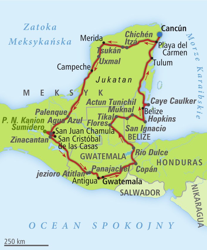 Gotowi na niezwykłą podróż przez cztery kraje Ameryki Środkowej? Meksyk, Gwatemala, Honduras i Belize odkryją przed Tobą swoje najbardziej fascynujące oblicza – od majestatycznych ruin Majów w Chichén Itzá, Uxmal, Palenque, Copán i Tikal, po kolorowe kolonialne miasta jak Antigua czy Merida, pełne klimatycznych uliczek i zabytkowych kościołów. Spotkania z lokalnymi społecznościami pozwolą Ci poznać tradycje Majów i Garifunów, a warsztaty kulinarne i degustacje regionalnych przysmaków wprowadzą Cię w smakowe bogactwo tego regionu. W programie czekają także rejsy po jeziorach i rzekach, obserwacja dzikiej przyrody oraz możliwość wędrówek w wulkanicznych krajobrazach. Każdy dzień przynosi nowe widoki i emocje, od tropikalnych plaż po zabytkowe miasteczka, a fakultatywne atrakcje pozwolą dopasować wyjazd do własnych zainteresowań. Na zakończenie wycieczki zaplanowano relaks na karaibskiej wyspie, który pozwoli w pełni poczuć wyjątkowy klimat tego zakątka świata. Ten intensywny wyjazd to niebanalna propozycja dla prawdziwych poszukiwaczy przygód!