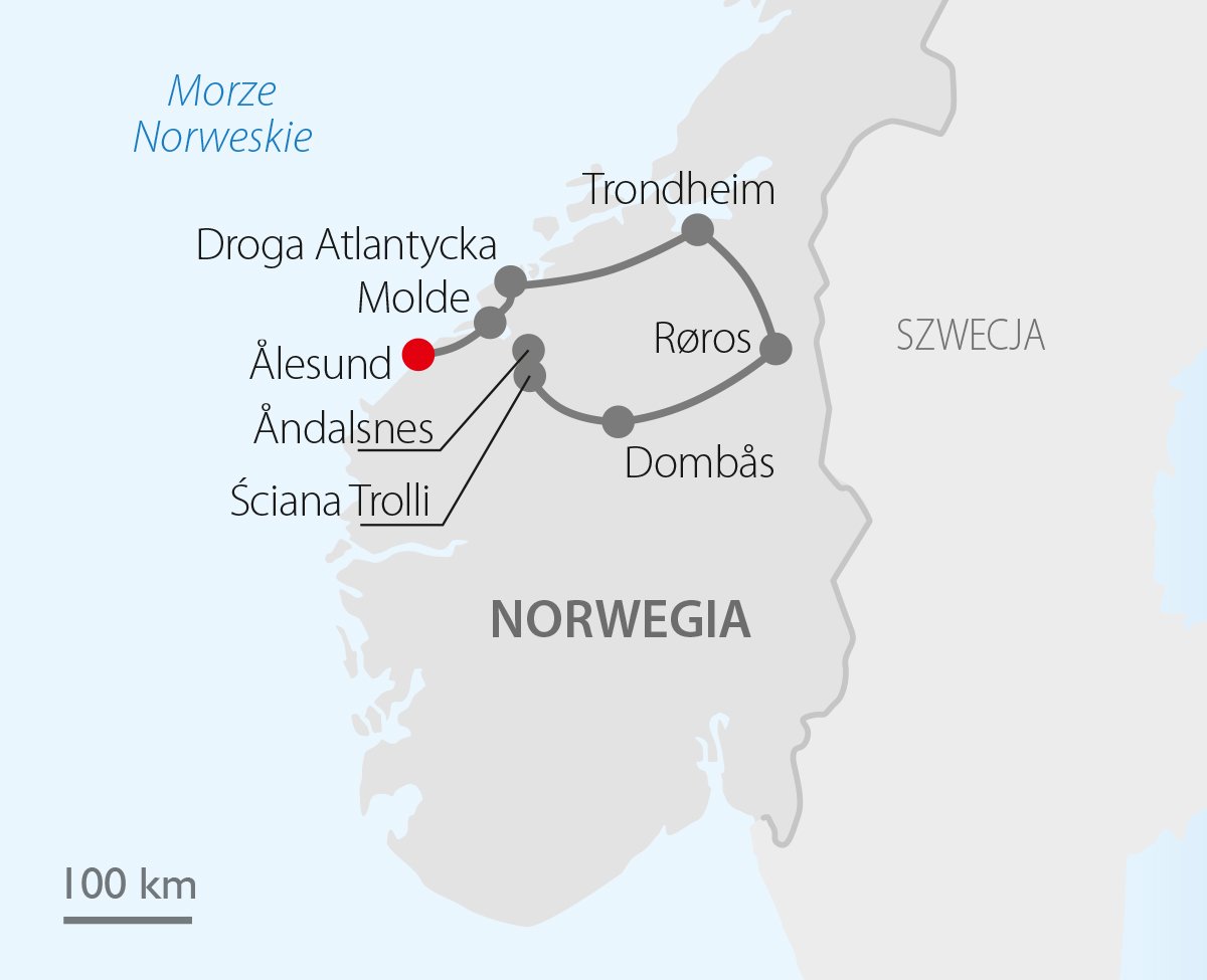 Ponad ośmiokilometrowa droga łącząca wyspę Averøy z lądem, przebiegająca przez archipelag małych wysp i półwyspów na Morzu Norweskim – to właśnie Droga Atlantycka, niewątpliwy symbol Norwegii i najpiękniejsza trasa samochodowa na świecie. Wyrusz z nami w podróż, która prowadzi przez malownicze wioski, górskie doliny i urokliwe miasteczka wpisane na listę UNESCO. Pospaceruj po uliczkach Ålesund w otoczeniu pięknych, secesyjnych kamienic, poznaj Trondheim – dawną stolicę wikingów, poczuj atmosferę górniczego miasta Røros i zachwyć się panoramą Romsdalsfjordu z punktu widokowego. To wyprawa, w której historia, kultura i przyroda splatają się w jedną, niezapomnianą opowieść.