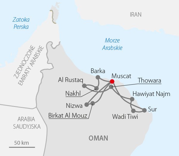 Wciąż tajemniczy sułtanat Omanu odkrywa swoje sekrety. W programie jego 2 stolice: aktualna – orientalny Muskat ze wspaniałym nabrzeżem, pałacem Sułtana Qaboosa oraz meczetem i dawna – Nizwa, która zachowała swój niezwykły urok. Na trasie także majestatyczne góry Hadżar, zielone gaje palmowe, przepiękne pustynne forty oraz wadi, przynoszące ulgę od palącego, pustynnego słońca. Nie zabraknie także czasu na wypoczynek i plażowanie, a dla chętnych rejs i snurkowanie na rafie koralowej.