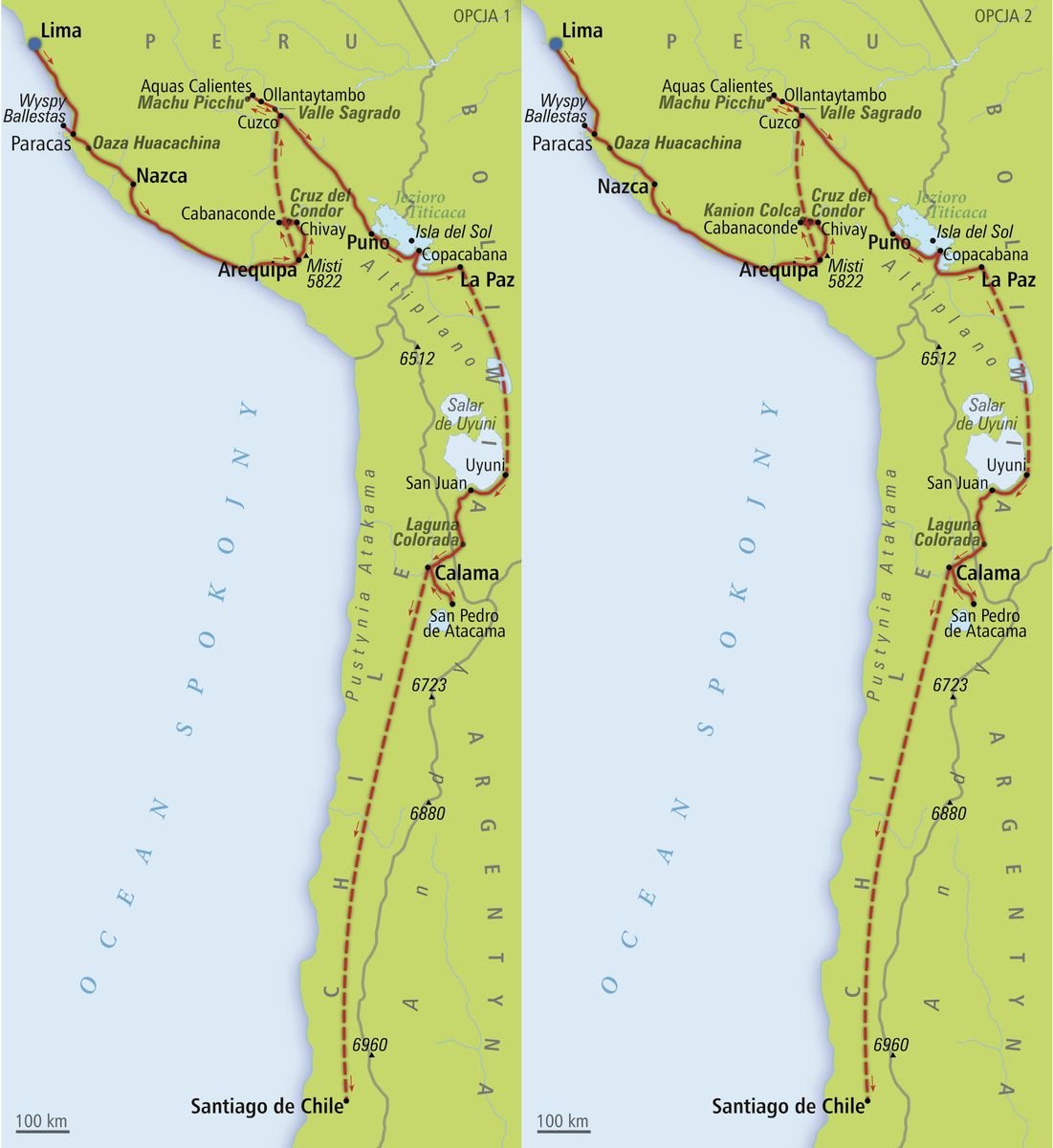Podróż od kosmopolitycznej stolicy Peru – Limy, po położoną ponad 3000 km na południe stolicę Chile – Santiago de Chile, to prawdziwa latynoska przygoda w pigułce: od malowniczych Wysp Ballestas („Małe Galapagos!”), aż po pustynię Atacama. Czeka Cię wiele atrakcji i niesamowitych wspomnień – obserwuj kondory szybujące nad Kanionem Colca, poznaj kulturę prekolumbijską w Machu Picchu i zanurz się w gorących źródłach, odpoczywając po wyprawie na unikatowym boliwijskim solnisku Uyuni. W trakcie ciekawego programu wypłyniesz w rejs po najwyżej położonym jeziorze na świecie – jeziorze Titicaca oraz zrobisz pamiątkowe zakupy na słynnym Targu Czarownic w La Paz. Trzy kraje, trzy stolice, trzy tygodnie i nieskończona liczba wspomnień, które zbierzesz podczas tej intensywnej wyprawy.