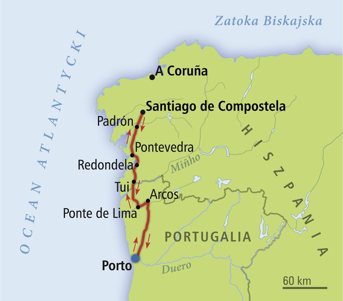 Porto • Arcos • Ponte de Lima • Tui • Redondela • Pontevedra • Padrón • Santiago de Compostela • Porto