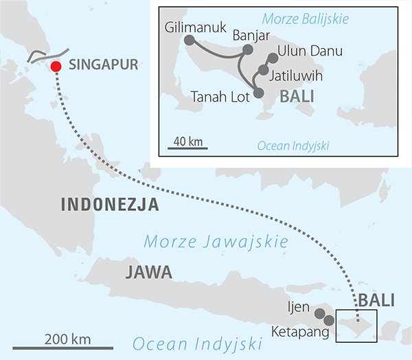 Singapur, kosmopolityczne miasto-państwo oraz dwie legendarne wyspy Indonezji – Bali i Jawa składają się na bardzo ciekawą, pełną wrażeń wycieczkę. Singapur imponuje rozmachem, fascynuje połączeniem tradycji z nowoczesnością. Wyspy przyciągają kulturą, tradycyjnymi obrzędami i niezwykłą przyrodą. W znakomicie zaplanowanym i urozmaiconym programie są nieziemskie pejzaże z majestatycznymi wulkanami, wizyty w starożytnych świątyniach, spektakularne tarasy ryżowe, a także chwila relaksu na rajskich plażach Bali.