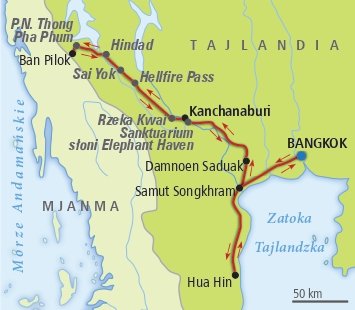 Śniadanie, wykwaterowanie. Wyjazd wcześnie rano do SAMUT SONGKHRAM, które słynie z bazaru Talad Rom Hup, przez środek którego cztery razy dziennie przejeżdża pociąg. Kupcy na czas przejazdu pociągu szybko zwijają swoje stoiska, a następnie ponownie je rozkładają. Przejazd do DAMNOEN SADUAK, gdzie znajduje się najsłynniejszy w Tajlandii pływający targ. Okoliczni kupcy sprzedają z łodzi owoce, warzywa, czy lokalne wyroby. Można również spróbować tradycyjnych dań przygotowywanych na łodziach. Następnie wyjazd do prowincji KANCHANABURI, położonej tuż przy granicy z Birmą. Wizyta w SANKTUARIUM SŁONI ELEPHANT HAVEN w Kanchanaburi, gdzie zobaczyć można, jak zachowują się te przepiękne zwierzęta w naturalnym środowisku, nakarmić je, poznać wiele ciekawych faktów na ich temat, a dla odważnych – możliwość kąpieli w rzece Kwai ze słoniami. Obiad w lokalnej restauracji na terenie sanktuarium. Późnym popołudniem przejazd do miasta Kanchanaburi. Czas wolny przy słynnym moście na RZECE KWAI. Zakwaterowanie i nocleg w hotelu.