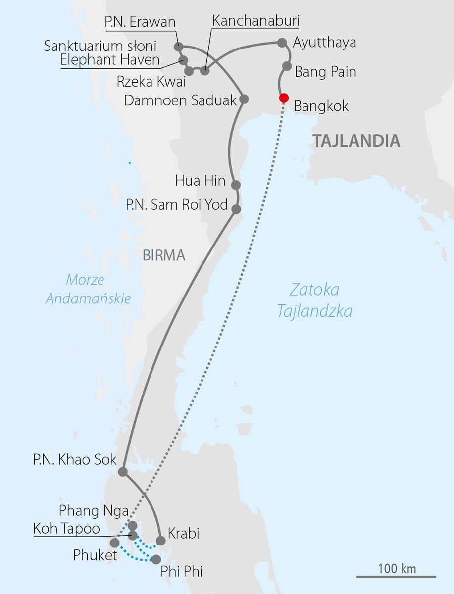 Fantastyczne krajobrazy egzotycznych parków narodowych i wspaniałe zabytki świadczące o historii Tajlandii. W programie Bangkok z majestatycznymi świątyniami, Ayutthaya oraz najsłynniejszy, pełen kolorów i zapachów pływający targ w Damnoen Saduak. Uczestnicy wyprawy będą płynąć tradycyjną łodzią po rzece Chao Phraya i kanałach Bangkoku, zaplanowano także rafting bambusowymi tratwami po rzece Kwai. Wielką atrakcją jest rejs łodziami motorowymi w parku Khao Sok po jeziorze z malowniczymi formacjami skalnymi. Wycieczkę kończy pełen relaks na cudownych plażach Krabi.