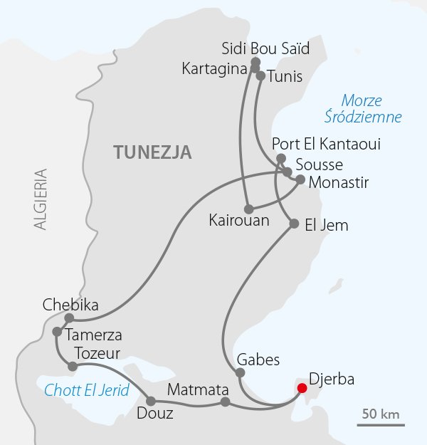 Wszystkie najsłynniejsze zabytki Tunezji w ciągu znakomicie zaplanowanego tygodnia. Miejsca z Listy Światowego Dziedzictwa UNESCO: ruiny starożytnego amfiteatru w El Jem, medyna w Tunisie, Kairouan – święte miasto islamu. W programie przejazd samochodami terenowymi, wizyty w medynach i na tradycyjnych bazarach, pustynne pejzaże oraz saharyjski księżycowy krajobraz i liczne oazy, które stały się tłem znanych produkcji filmowych, m.in. „Gwiezdne wojny”, „Indiana Jones”, „Angielski pacjent”. Na całej trasie hotele o wysokim standardzie. Warto połączyć wycieczkę z tygodniowym wypoczynkiem na Djerbie w wybranym hotelu z oferty ITAKI.