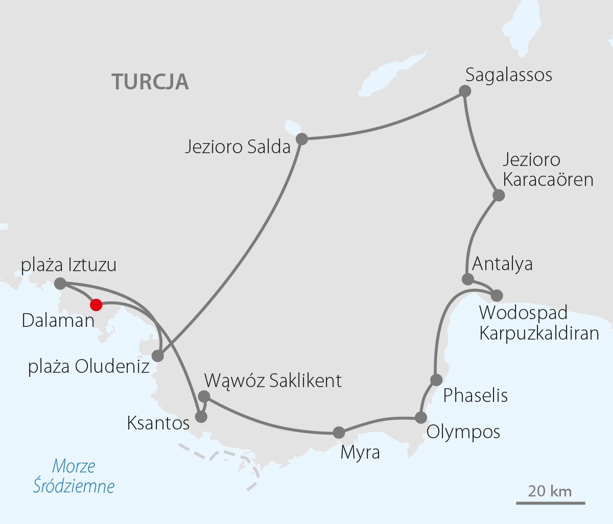 Odkryj największe skarby południowej Turcji w ciągu znakomicie zaplanowanego tygodnia: wędruj po szlakach starożytnej Licji, poznaj jej fascynującą historię, podziwiaj ruiny antycznych miast i świątyń oraz niezwykłe krajobrazy urzekające naturalnym pięknem: malownicze wąwozy, zachwycające wodospady i majestatyczne góry Taurus. Na trasie starożytne miasta cywilizacji licyjskiej: Ksantos – wspomniany w „Iliadzie” Homera, Myra, kojarzona z legendą św. Mikołaja oraz malowniczo położone Olympos. W programie nie zabraknie też czasu na ekscytujący rejs katamaranem po jeziorze otoczonym przez Bursztynowy Kanion i chwili relaksu na słynnych plażach Turkusowego Wybrzeża: Oludeniz i Iztuzu, która jest jednym z ostatnich miejsc lęgowych żółwi Caretta caretta w basenie Morza Śródziemnego. Po intensywnym tygodniu warto połączyć wycieczkę z dodatkowym wypoczynkiem w wybranym hotelu z oferty ITAKI.
