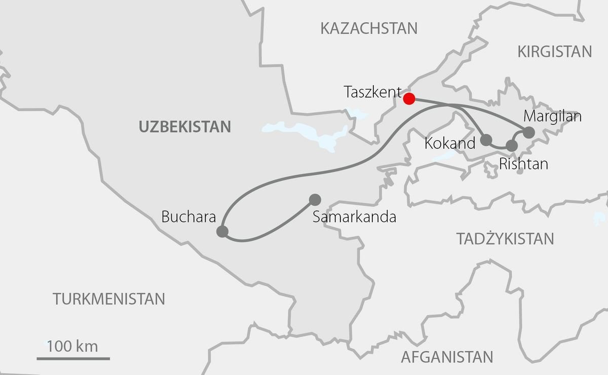 Śniadanie. Zwiedzanie KOKANDU, którego początki sięgają X w. Miasto leżące na Jedwabnym Szlaku, ważnym szlaku handlowym z Chin do Indii, było głównym ośrodkiem religijnym, gdzie znajdowało się ponad 300 meczetów. Wizyta w Pałacu Khudoyarkhan z XIX w., warowni i siedziby ostatniego chana, nazywanego perełką Kokandu. Następnie mauzoleum Modarikhan – rodzinny grobowiec chanów, meczet Djami z 98 misternie rzeźbionymi kolumnami i z 22-metrowym minaretem na dziedzińcu oraz madrasa Norbutabi – największe centrum religijne Kokandu. Przejazd do RISHTANU – jednego z największych w Azji Środkowej centrum wyrobu ceramiki. Charakterystyczną cechą tego ośrodka jest niepowtarzalny turkusowo-ultramarynowy kolor, odmienny od koloru ceramiki z innych ośrodków w Azji. Wizyta w warsztacie, poznanie techniki wyrobu i malowania ceramiki. Czas wolny. Przejazd do MARGILAN, jednego ze starożytnych miast Uzbekistanu leżących na Jedwabnym Szlaku, ważnego ośrodka międzynarodowego handlu. Wizyta w fabryce jedwabiu i zapoznanie z procesem ręcznego wyrobu materiału. Jedwabie wyrabiane w Margilan słynęły z jakości i były pożądanym materiałem na dworach władców na całym świecie. Przejazd na stację kolejową i do Taszkentu. Zakwaterowanie w hotelu, kolacja, nocleg.