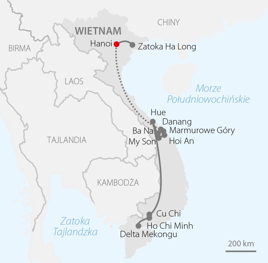 Zapraszamy na odkrywanie fascynującego Wietnamu – kraju kontrastów, w którym możesz zarówno wypocząć na plaży, odwiedzić lokalne restauracje, jak i przeżyć przygodę w kolonialnym stylu! W programie m.in. rejs po zatoce Ha Long, jednym z najpiękniejszych cudów natury, z noclegiem na statku. Zaplanowano także zwiedzanie stolicy Wietnamu – Hanoi oraz dawnego Sajgonu, czyli Ho Chi Minh. Podczas wycieczki nie zabraknie przejazdu malowniczą trasą wśród pól ryżowych Delty Mekongu, gdzie rozlewiska rzeki tworzą gęstą sieć dróg wodnych i kanałów oraz rejsu łodzią po rzece Mekong. Zobaczysz także słynące z pięknych grot i pagód Marmurowe Góry. Dla chętnych zaplanowano ciekawy program fakultatywny: wycieczkę do górskiej miejscowości Ba Na oraz wycieczkę do Hue, dawnej stolicy Wietnamu. Nie zabraknie także czasu na wypoczynek blisko plaży w położonym nad piękną zatoką Danang.