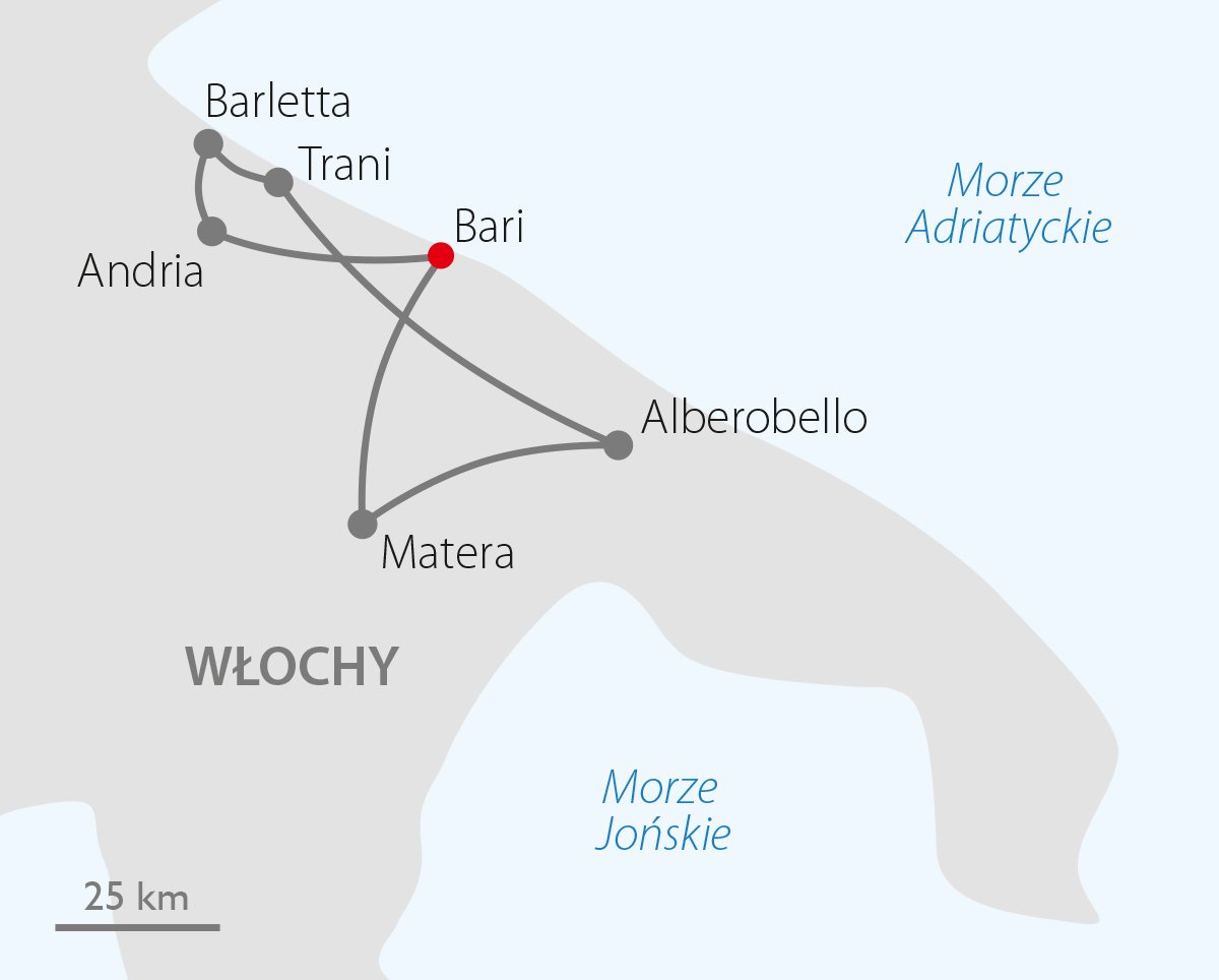 Śniadanie. Wykwaterowanie. Przejazd do TRANI, portowego miasta z wąskimi i urokliwymi średniowiecznymi uliczkami. Miasto rozwijało się w średniowieczu, wyruszały stąd krucjaty kościoła przeciwko niewiernym. Spacer po centrum starego miasta i porcie, zwiedzanie katedry Basilica di San Nicola Pellegrino z XII w., przejście obok Castello di Trani. Przejazd do BARLETTY – średniowiecznego miasteczka znanego z twierdzy Svevo z X w., gdzie w średniowieczu mieściły się koszary dla rycerzy wyruszających na krucjaty do Ziemi Świętej. Pamiątkowe zdjęcia przy Kolosie z Barletty – największej atrakcji turystycznej miasta. Jest to posąg z brązu, przedstawiający cesarza rzymskiego o dotychczas nieustalonej tożsamości. Posąg ma ponad 5 m wysokości, pochodzi z ok. VII w. Czas wolny. Przejazd do ANDRII. Zwiedzanie tajemniczego zamku Castel del Monte z XIII w., wpisanego na listę UNESCO. Przejazd do hotelu w Bari, zakwaterowanie. Fakultatywnie (za dodatkową opłatą na miejscu) wyjście na kolację do restauracji serwującej dania kuchni lokalnej. Powrót do hotelu, nocleg.
