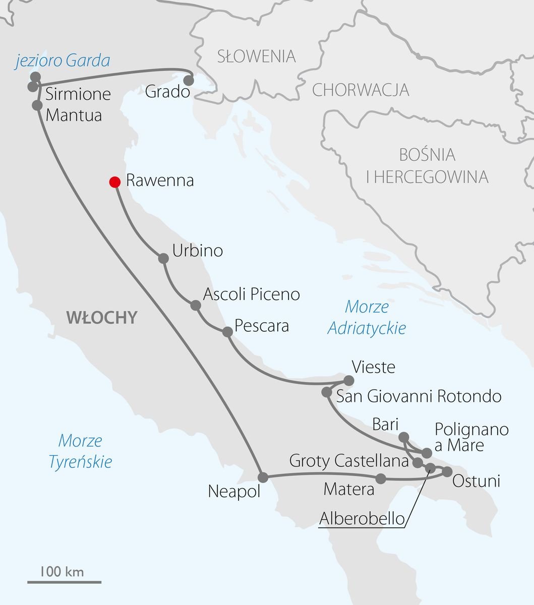 Niezapomniana podróż do południowej Italii szlakiem znanych regionów, jak Veneto i Emilia-Romania, wspaniałych plaż nad Adriatykiem w Rimini oraz urokliwych zakątków mniej znanych, ale równie intrygujących i pięknych regionów Marche i Abruzja, na deser z niesamowitą Apulią! Piękne, piaszczyste plaże, białe zabudowania miasteczek mieniące się w południowym słońcu, senny klimat, lazurowe fale morza i niezliczona ilość skarbów minionych epok... to po prostu trzeba przeżyć! Opuszczając Apulię wizyta w znanej na całym świecie Materze z miastem zawieszonym na skale głębokiego wąwozu, dalej w programie niezwykły Neapol – stolica regionu Kampania i zapierające dech jezioro Garda w Lombardii, a na pożegnanie znana wyspa Grado, nazywana Wyspą Słońca!