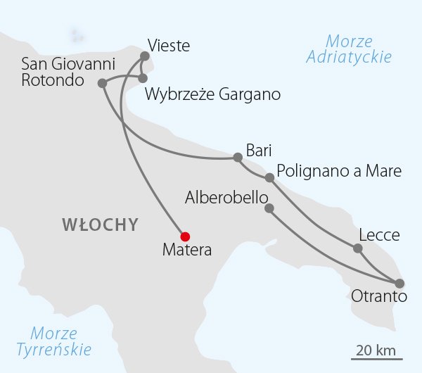 Słońce, przepiękne krajobrazy, niezwykłe zabytki, turkusowe morze to atuty Apulii, regionu rozciągającego się od ostrogi aż do obcasa włoskiego buta. Trasa wiedzie przez wykutą w skale Materę, Alberobello z dzielnicą bajkowych domków „trulli”, przepiękne barokowe Lecce i Bari – stolicę Apulii. Warto poznać atmosferę południa, spacerując przez białe, nieco senne Otranto oraz odwiedzić miejsce spoczynku znanego mistyka Ojca Pio. Na pewno oczaruje też Polignano a Mare z piaszczystymi plażami. Dodatkowo fakultatywny rejs wzdłuż wybrzeża Gargano to relaks i niezapomniane pejzaże urokliwych wysp. Warto przedłużyć pobyt o wypoczynek na wybrzeżu Kalabrii, w wybranym hotelu z oferty ITAKI. Trasa we Włoszech: ok. 1220 km.