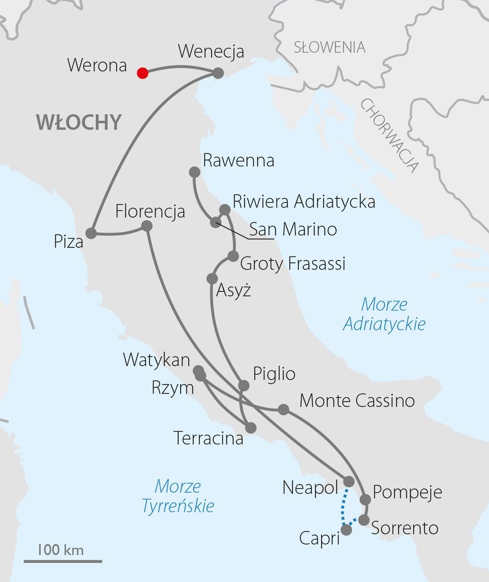 „Bella Italia”, czyli flagowy program ITAKI istniejący już od 35 lat, teraz w odświeżonej, jeszcze atrakcyjniejszej odsłonie! To podróż z północy na południe kraju, łącząca codzienne odkrywanie najpiękniejszych skarbów Italii. Od Werony – miasta szekspirowskiej Julii, przez romantyczną Wenecję, aż do skarbów światowej sztuki we Florencji i Neapolu, gdzie życie tętni w zawrotnym rytmie. W programie słynna Krzywa Wieża w Pizie, Asyż ze swoim proekologicznym świętym, Piglio słynące z produkcji wina o tej samej nazwie oraz Monte Cassino z chwilą zadumy na Polskim Cmentarzu Wojennym. Klasyczny program zwiedzania Rzymu i Watykanu, wizyta w starożytnych Pompejach i kunsztowne mozaiki w Rawennie to kolejne atuty wycieczki. W planie także znane kurorty: Sorrento i Rimini oraz nieco natury: wyspa Capri i Groty Frasassi. Nie zapomniano również o odpoczynku nad Morzem Tyrreńskim i degustacji włoskich specjałów. Dla chętnych możliwość udziału w rzymskiej kolacji i wspólnej zabawie w lokalnej restauracji, przy muzyce na żywo. To Włochy w pełnej krasie – piękne, różnorodne i niepowtarzalne.