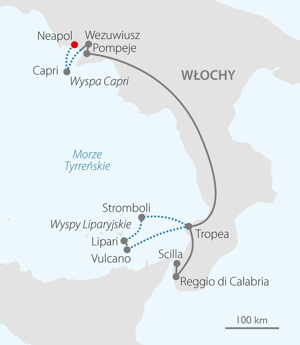 Co składa się na magię Capri? Czym fascynuje wszystkich ta mała wyspa? W pięknej wycieczce na południe Italii, Capri jest kwintesencją uroku i fenomenem tej części Włoch. Trasa obejmuje dwa sąsiednie regiony: Kalabrię i Kampanię. Światowej klasy zabytki, wspaniały klimat, śródziemnomorska przyroda, przepiękne krajobrazy, ciepłe morze, wyśmienita kuchnia i radość życia mieszkańców włoskiego "Mezzogiorna" sprawiają, że jest to kraina, którą warto odwiedzić. Program obejmuje zwiedzanie Neapolu, tętniącej życiem klimatycznej stolicy regionu Kampania, ojczyzny pizzy Margherita, miasta wspaniałych zabytków i muzeów. Na trasie także Wezuwiusz i wizyta w Pompejach – antycznym mieście, gdzie przed wiekami zatrzymał się czas. W drugiej części wycieczki pobyt w hotelu blisko morza w Kalabrii, nazywanej „ziemią do odkrycia”. Przepiękna Tropea dumnie wznosząca się na nadmorskiej skale, jest jednym z najczęściej fotografowanych miejsc Kalabrii. Fakultatywna wycieczka na Wyspy Liparyjskie jest wspaniałym uzupełnieniem tej wyjątkowej podróży. Trasa we Włoszech: ok. 970 km.