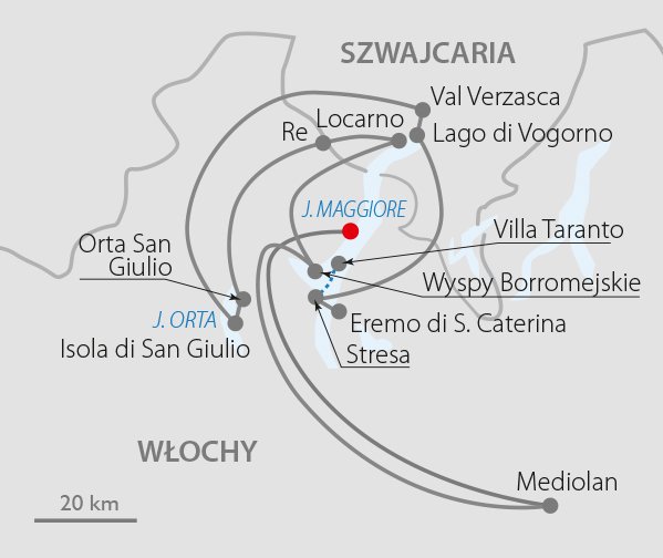 Piękno włoskiej krainy jezior, wspaniały klimat, mistyka spektakularnie położonych sanktuariów to tylko część walorów tej trasy, obfitującej w niezapomniane widoki. Trasa wiedzie przez dwa regiony: Lombardię i Piemont, zahaczając o przygraniczne rejony Szwajcarii. W programie są dwa słynne jeziora: Maggiore i Orta, rejsy na malownicze wysepki i przejazd przepiękną trasą kolejką Centovalli. Miłośników Jamesa Bonda na pewno zainteresuje wizyta w miejscu kaskaderskiego skoku, otwierającego „GoldenEye”. Kosmopolityczny Mediolan to prawdziwa uczta dla miłośników sztuki oraz osób zainteresowanych najnowszymi trendami mody. Trasa we Włoszech: ok. 950 km.