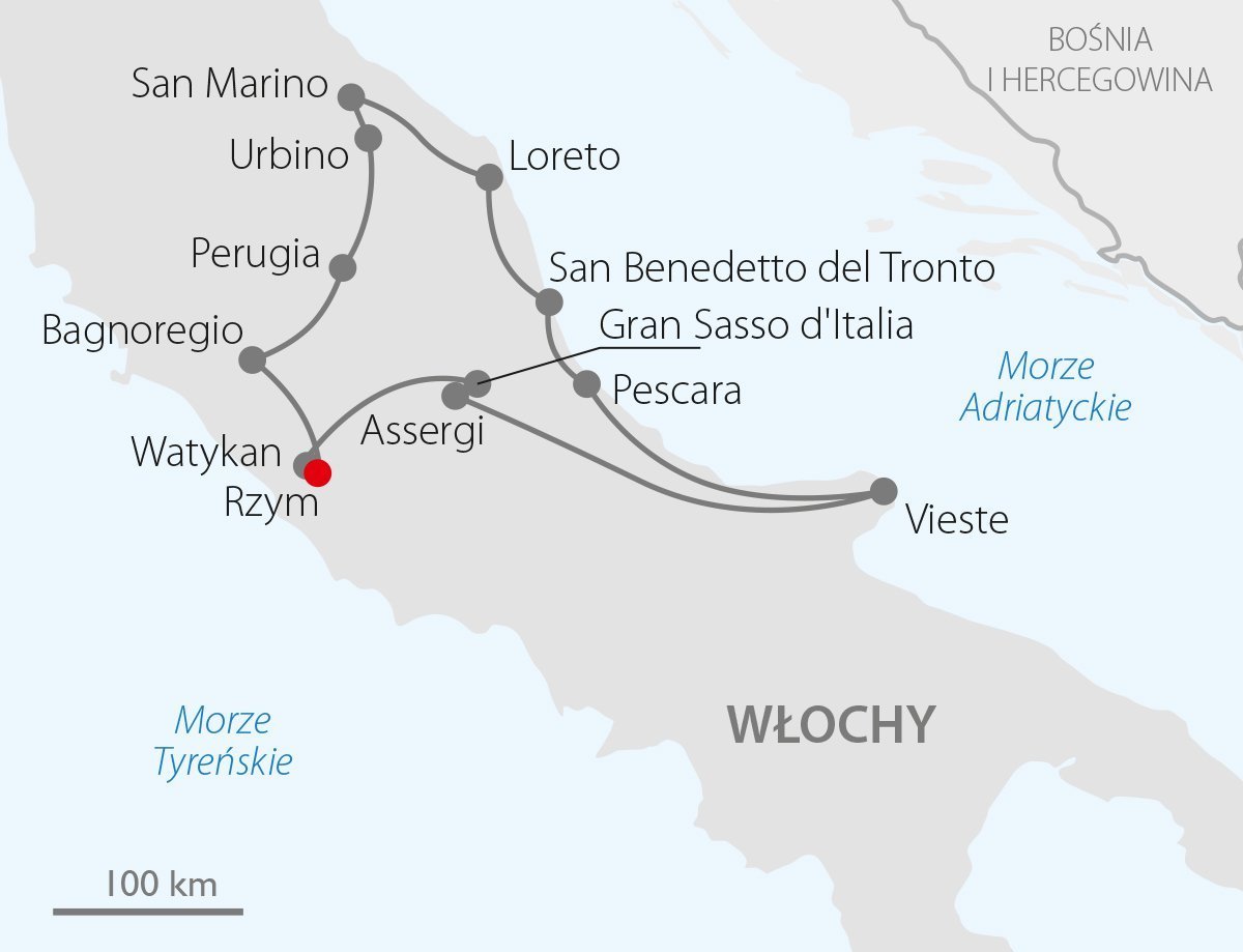 Wycieczka przeznaczona dla osób zakochanych we Włoszech, pragnących odkrywać nowe miejsca, delektować się włoskim jedzeniem, zachwycać się krajobrazami i korzystać z piaszczystych plaż. Region Abruzja zaprasza na najwyższy masyw Apeninów we Włoszech – Gran Sasso oraz oferuje czyste piaszczyste plaże. Marche posiada urocze miasteczka i kurorty, które odwiedzimy, a Apulia z białymi miasteczkami i lazurowymi wodami dostarczy mnóstwo pięknych krajobrazów i urokliwych miejsc. Będzie czas na kąpiel w Adriatyku, posmakowanie kuchni regionalnej, rejs łódkami po lazurowych wodach oraz moc niezapomnianych wrażeń.