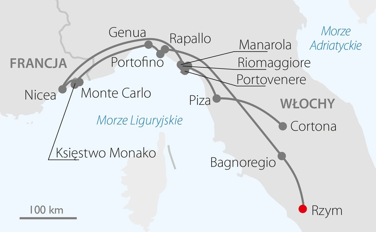 Zapraszamy na podróż wzdłuż wybrzeża Morza Liguryjskiego, uważanego za jedno z najpiękniejszych w Italii. Na trasie 3 państwa i znane miejsca, m.in. Księstwo Monako, Nicea, Genua czy Cinque Terre. Podczas przejazdu okazja do zwiedzenia Cortony i Pizy w najsłynniejszym regionie Włoch, Toskanii, a także urokliwego Bagnoreggio. To wielka uczta dla miłośników włoskich pejzaży, choć nie zabraknie też uczty dla ciała: zapraszamy na degustację połączoną z obiadokolacją w starej fattori, produkującej wina.
