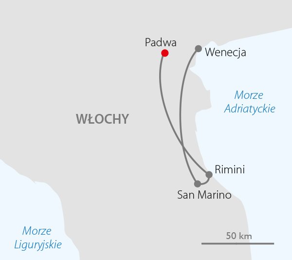Wycieczki autokarowe ITAKI to doświadczenie i profesjonalizm. Dla wszystkich, którzy lubią podróże w klasycznym stylu, cały czas pod opieką pilota, krok po kroku odkrywając niezwykłe miejsca i poznając osoby o podobnych zainteresowaniach. Jeśli chcesz połączyć zwiedzanie z wypoczynkiem na plaży, ta wycieczka jest w sam raz dla Ciebie! Odkryj ponadczasową urodę Wenecji, odwiedź piękną Padwę, miasto św. Franciszka, spaceruj krętymi uliczkami San Marino, daj się uwieść Rimini – tętniącej wakacyjnym życiem stolicy Riwiery Adriatyckiej, ze wspaniałą piaszczystą plażą, setkami barów, restauracji i sklepów, a także mnóstwem atrakcji dla całej rodziny. Łączna trasa we Włoszech: ok. 1050 km.