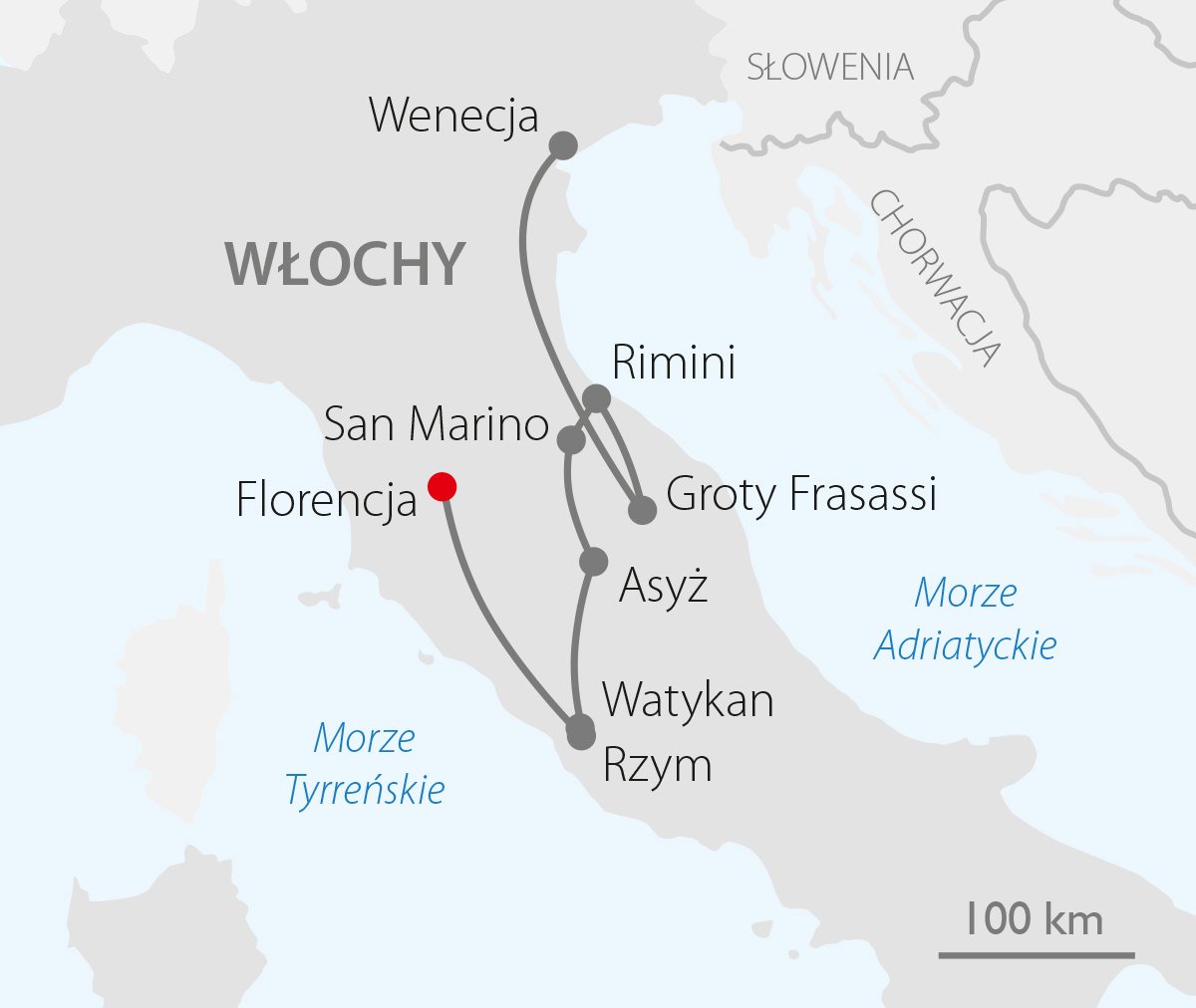 Bardzo lubiana wycieczka, połączenie objazdówki i pobytu w słynnym włoskim kurorcie Rimini. W programie zwiedzanie Florencji, w której nagromadzenie zabytków przyprawia o zawrót głowy, spacer po centrum Wiecznego Miasta i wizyta w miejscu spoczynku Jana Pawła II, przepiękny Asyż – ojczyzna św. Franciszka – z bazyliką, w której zachwycają freski Giotta i romantyczna Wenecja. Rimini – to zmiana nastroju. Cztery dni w najpopularniejszym kurorcie nad Adriatykiem to nieskończenie wiele możliwości: szeroka, piaszczysta, znakomicie zagospodarowana plaża kusi słodkim „nicnierobieniem”. Dyskoteki, kluby i bary czekają na imprezowiczów, smakosze docenią restauracje z owocami morza, a miłośnicy zakupów znajdą sklepy dostępne na każdą kieszeń. Kameralne centrum Rimini to idealne miejsce na wieczorny spacer. Warto się wybrać na wycieczkę fakultatywną do Grot Frasassi, niezwykłego systemu jaskiń krasowych w okolicy miejscowości Genga. Łączna trasa we Włoszech: ok. 2700 km.