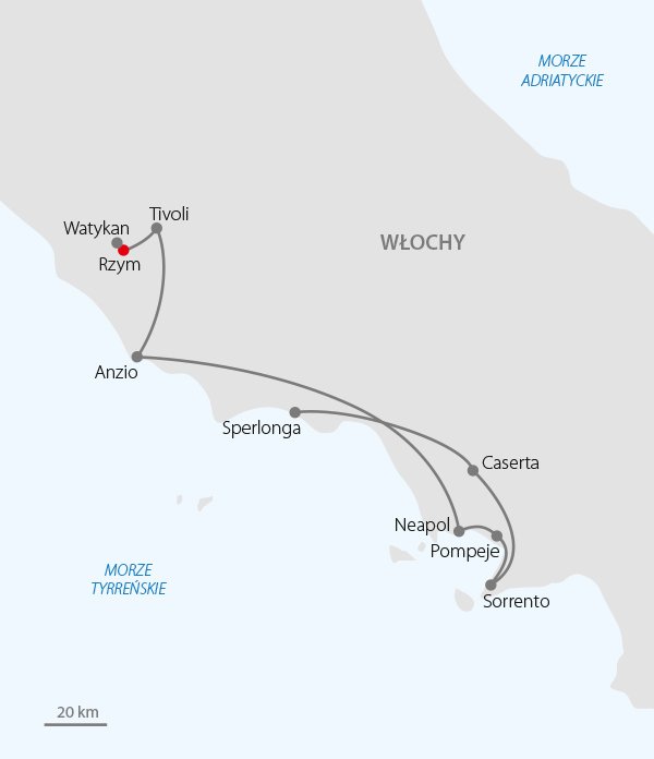 Stolica kraju – Rzym i symbol włoskiego południa – Neapol, to dwa miasta o odmiennych duszach i obliczach. Stonowany, majestatyczny Rzym z Watykanem, to zupełnie inny świat niż Neapol, gdzie na ulicach i placach panuje wiecznie zamieszanie i gwar, a pranie, jak dawniej, suszy się na balkonach. Łączy je jednak wiele – smakowita pizza wypalana w tradycyjny sposób, aromatyczny zapach espresso w barach, niezliczona ilość past, czyli makaronów przygotowanych na wiele sposobów i z wieloma dodatkami oraz lody w wielu smakach. To wycieczka dla tych, którzy chcą odwiedzić stolicę Włoch, podziwiać monumentalne rzeźby i obrazy w Watykanie, a także skosztować pizzy margherity w Neapolu – miejscu jej narodzin. Urozmaiceniem dla 2 gwarnych miast będą: senne Sorrento, znane z festiwali włoskiej piosenki, królewskie ogrody w Casercie oraz piaszczyste plaże Anzio i Sperlongi.