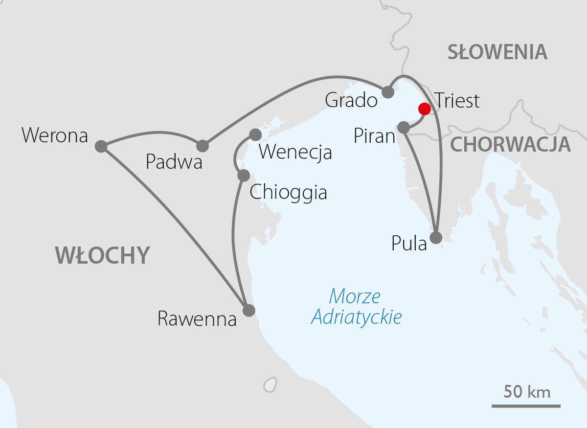 Zapraszamy na podróż obejmującą trzy sąsiadujące kraje nad Morzem Adriatyckim: dobrze znaną i uwielbianą przez turystów Chorwację, wciąż odkrywaną Słowenię oraz Italię, która od lat oczarowuje Polaków. To wyprawa do średniowiecznej Republiki Wenecji – jednej z największych potęg handlowych i politycznych w basenie Morza Śródziemnego, której stolicą była Wenecja, jedno z najbogatszych miast Europy. To również okazja, by odkrywać zakątki tej dawnej republiki, ślady jej świetności i delektować się lokalną kuchnią. Na trasie znajdą się także Werona i Rawenna. Do zobaczenia nad Adriatykiem!
