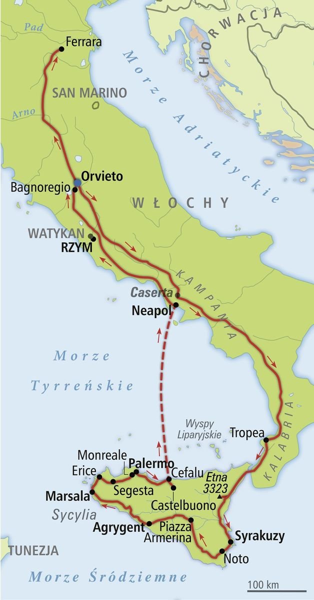 Trasa długo wyczekiwana przez naszych klientów. Sycylia – wyspa mitów i legend, ze wspaniałymi zabytkami z czasów antycznych to mozaika kultur i narodów, które uczyniły ją tak ekscytującą. Do klasycznej trasy po wyspie, dodaliśmy południe Włoch. Proponujemy pełne wrażeń 2 tygodnie zwiedzania, przeplatane wolnymi popołudniami nad morzem, które mają zrelaksować i dodać sił na kolejne dni. Urozmaicony program zadowoli najbardziej wytrawnych podróżników. W programie degustacje, topowe miasta włoskiego południa, promowania, wspaniałe widoki i historyczne miejsca sprzed kilku tysięcy lat. Trasa we Włoszech: ok. 3900 km.