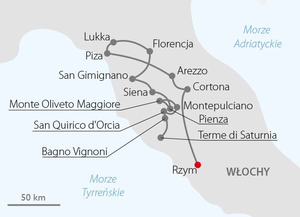 Program dedykowany miłośnikom Toskanii, szukającym pięknych miejsc i niezapomnianych widoków. Od oddalonych od zgiełku i gwaru sennych miejscowości leżących pośród alei cyprysowych, po gwarne miasta, tętniące życiem od rana do nocy. Ta część Włoch od wieków uwieczniana przez artystów, będąca miejscem akcji wielu znanych filmów, jest jednym z najchętniej odwiedzanych regionów w Europie. Uwielbiają ją nie tylko miłośnicy sztuki i architektury, ale także pasjonaci doskonałej włoskiej kuchni. W programie klasyczne, toskańskie krajobrazy – wzgórza, cyprysy i winnice w urokliwym Val d’Orcia, najsłynniejsze miasta sztuki, średniowieczne Arezzo z placem miejskim znanym z filmu Benigniego „Życie jest piękne”, Pienza – perełka włoskiego renesansu. Dużą atrakcją będzie kolacja w starej fattorii połączona z degustacją najlepszych toskańskich win i produktów regionalnych.