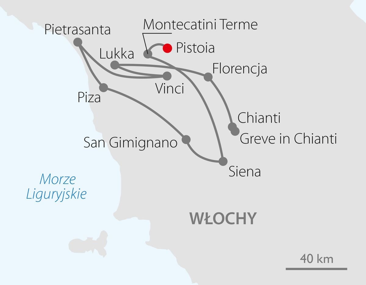 W godzinach porannych przyjazd do PISTOI, miasta niegdyś dorównującego świetnością Florencji. Spacer po bardzo starym centrum z jednym z najpiękniejszych średniowiecznych placów we Włoszech: Piazza del Duomo, katedra św. Zenona z ołtarzem św. Jakuba wykonanym z wytłaczanego srebra, baptysterium i dzwonnicą. Przejazd do hotelu w MONTECATINI TERME, miejscowości uzdrowiskowej znanej już w XIII w. z właściwości zdrowotnych tamtejszych wód termalnych. Zakwaterowanie w hotelu. Spacer po renomowanym kurorcie z elegancką zabudową uzdrowiskową i malowniczą starówką na wzgórzu. Powrót do hotelu. Obiadokolacja, nocleg.