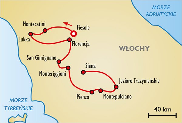 Program wycieczki powstał na specjalne życzenie naszych Klientów zakochanych w Toskanii. Dedykowany jest wszystkim, którzy pragną poszerzyć kolekcję zwiedzonych miejsc i po raz kolejny wrócić do Florencji. Świetny wyjazd także na „toskański debiut”, z możliwością poznania wielu aspektów składających się na oryginalność i wyjątkowość krainy artystów. Na urozmaiconej, bardzo ciekawej trasie najsłynniejsze miasta sztuki, przepiękny klasztor Monte Oliveto, Pienza – perełka włoskiego renesansu, ślady tajemniczych Etrusków we Fiesole, malownicze Alpy Apuańskie. W programie także wspólna degustacja toskańskich win, kolacja w starej fattorii i fantastyczna wycieczka fakultatywna nad Jezioro Trazymeńskie. Łączna trasa we Włoszech: ok. 1900 km.
