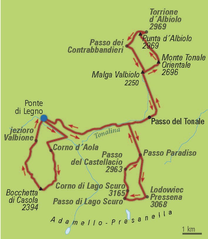 Śniadanie. Wyprawa na VIA FERRATĘ SENTIERO DEGLI AUSTRIACI. Jest to kolejna bardzo interesująca trasa, która oprócz tego, że oferuje spektakularne widoki na masywy górskie Presanella, Adamello i Ortles-Cevedale, to zawiera także mnóstwo pozostałości i cennych świadectw historycznych z czasów I wojny światowej. Przejazd do Passo Tonale. Wjazd koleją gondolową na szczyt MALGA VALBIOLO (2250 m n.p.m.). Przejście trawersem na szczyt MONTE TONALE ORIENTALE (2696 m n.p.m.). Na trasie znajdują się liczne stanowiska artyleryjskie i obwarowania militarne. Dalej trasa podchodzi na szczyty PUNTA D'ALBIOLO (2969 m n.p.m.) oraz TORRIONE D'ALBIOLO (2969 m n.p.m.). Zejście na przełęcz PASSO DEI CONTRABBANDIERI i powrót do stacji kolejki Malga Valbiolo. Zjazd koleją gondolową do Passo Tonale i powrót do hotelu. Kolacja. Nocleg. Trasa: ok. 9 km/ok. 5 godz. Suma podejść: 490 m ↗. Suma zejść: 790 m ↘. Wspinaczka: 180 m. Trudność via ferraty wg skali austriackiej: A/B.