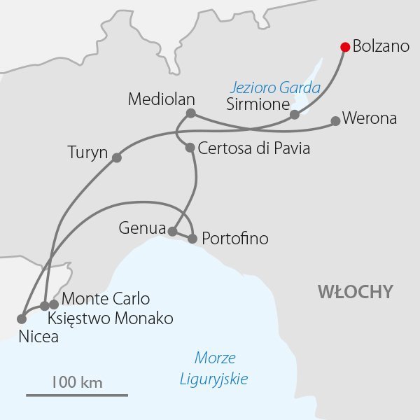 Pocztówkowa uroda Ligurii, bajkowe Sirmione to raj dla romantyków, którym nigdy nie dosyć rozmarzonych włoskich pejzaży. Liguria to znakomity cel na całoroczne zwiedzanie: słynie ze wspaniałego klimatu i słonecznych dni nawet w zimie. Ze wspaniałej pogody znane jest także jezioro Garda – rosną tu zimą nawet cytryny! Na trasie stolica światowej mody – Mediolan, wypad do Księstwa Monako i do stolicy Lazurowego Wybrzeża – Nicei. Wszystko w ciągu fantastycznie zaplanowanego i pełnego wrażeń tygodnia. To możliwość ucieczki z szarego jesienno-zimowego otoczenia po odrobinę słońca, w miejsca, gdzie średnia temperatur nie spada poniżej 10°C. Długość trasy we Włoszech: ok. 2100 km.