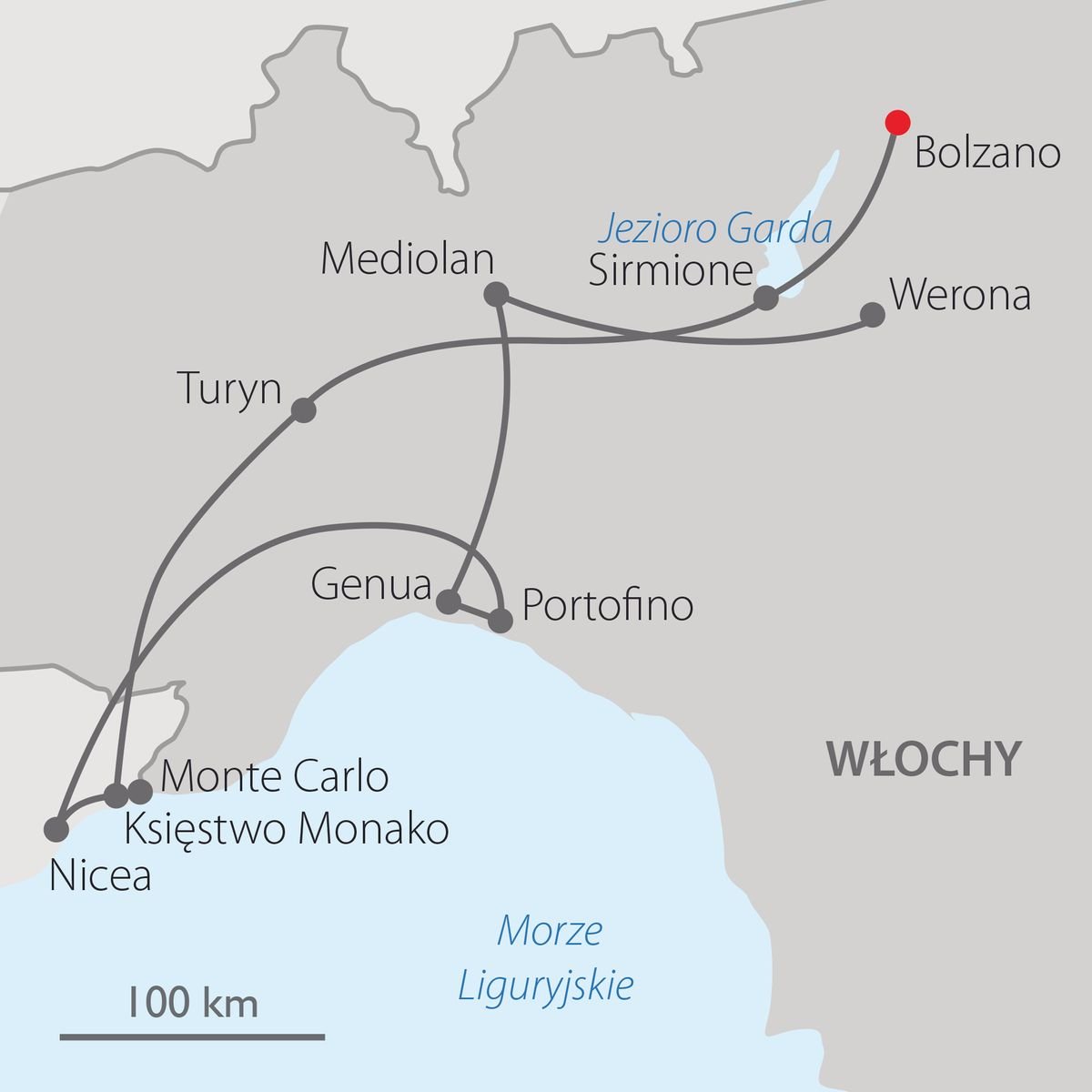 Pocztówkowa uroda Ligurii, bajkowe Sirmione to raj dla romantyków, którym nigdy nie dosyć rozmarzonych włoskich pejzaży. Liguria to znakomity cel na całoroczne zwiedzanie: słynie ze wspaniałego klimatu i słonecznych dni nawet w zimie. Ze wspaniałej pogody znane jest także jezioro Garda – rosną tu zimą nawet cytryny! Na trasie stolica światowej mody – Mediolan, wypad do Księstwa Monako i do stolicy Lazurowego Wybrzeża – Nicei. Wszystko w ciągu fantastycznie zaplanowanego i pełnego wrażeń tygodnia. To możliwość ucieczki z szarego jesienno-zimowego otoczenia po odrobinę słońca, w miejsca, gdzie średnia temperatur nie spada poniżej 10°C. Długość trasy we Włoszech: ok. 2100 km.