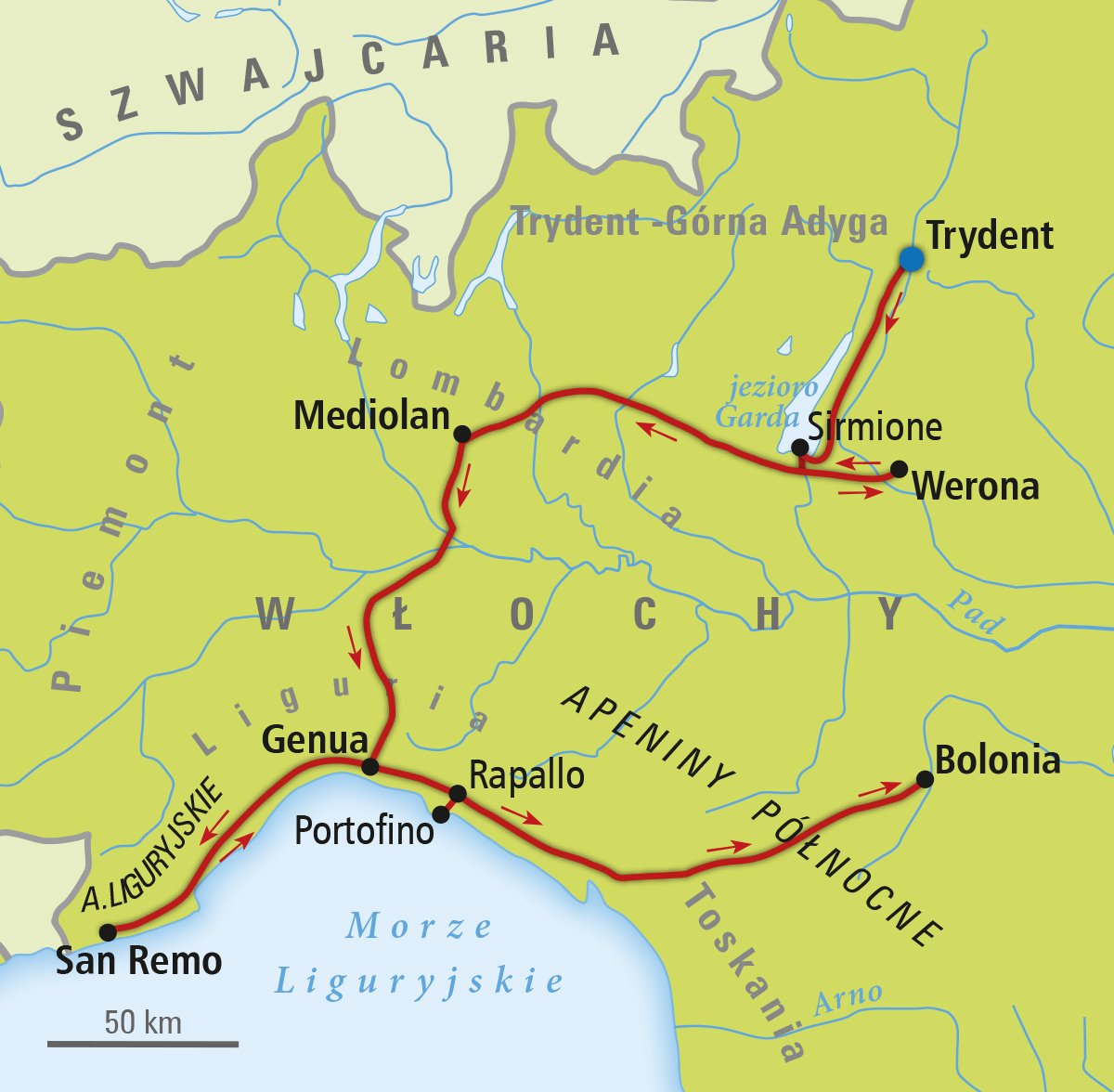 Tytułowe delicje to najpiękniejsze widoki północnych Włoch, którymi cieszyć się mogą uczestnicy wycieczki, od lat bardzo popularnej zarówno wśród debiutujących italofilów, jak i wśród osób, które chcą odkryć północne regiony Italii. Na trasie ciekawy Trydent – miasto słynne głównie z soboru w XVI w., z Dolomitami w tle, malownicze jezioro Garda, miasto kochanków Werona, kosmopolityczny Mediolan i Genua chwaląca się Krzysztofem Kolumbem. W maleńkim, położonym nad morzem regionie Liguria oczarowują dramatyczne krajobrazy gór, które schodzą do morza, zapach cytryn, smak pesto, wysadzane palmami promenady. W programie słynne San Remo, przepiękne Rapallo i Portofino, miejsca owiane nostalgią minionych czasów, natchnienie dla artystów. Łączna trasa we Włoszech: ok. 1600 km.