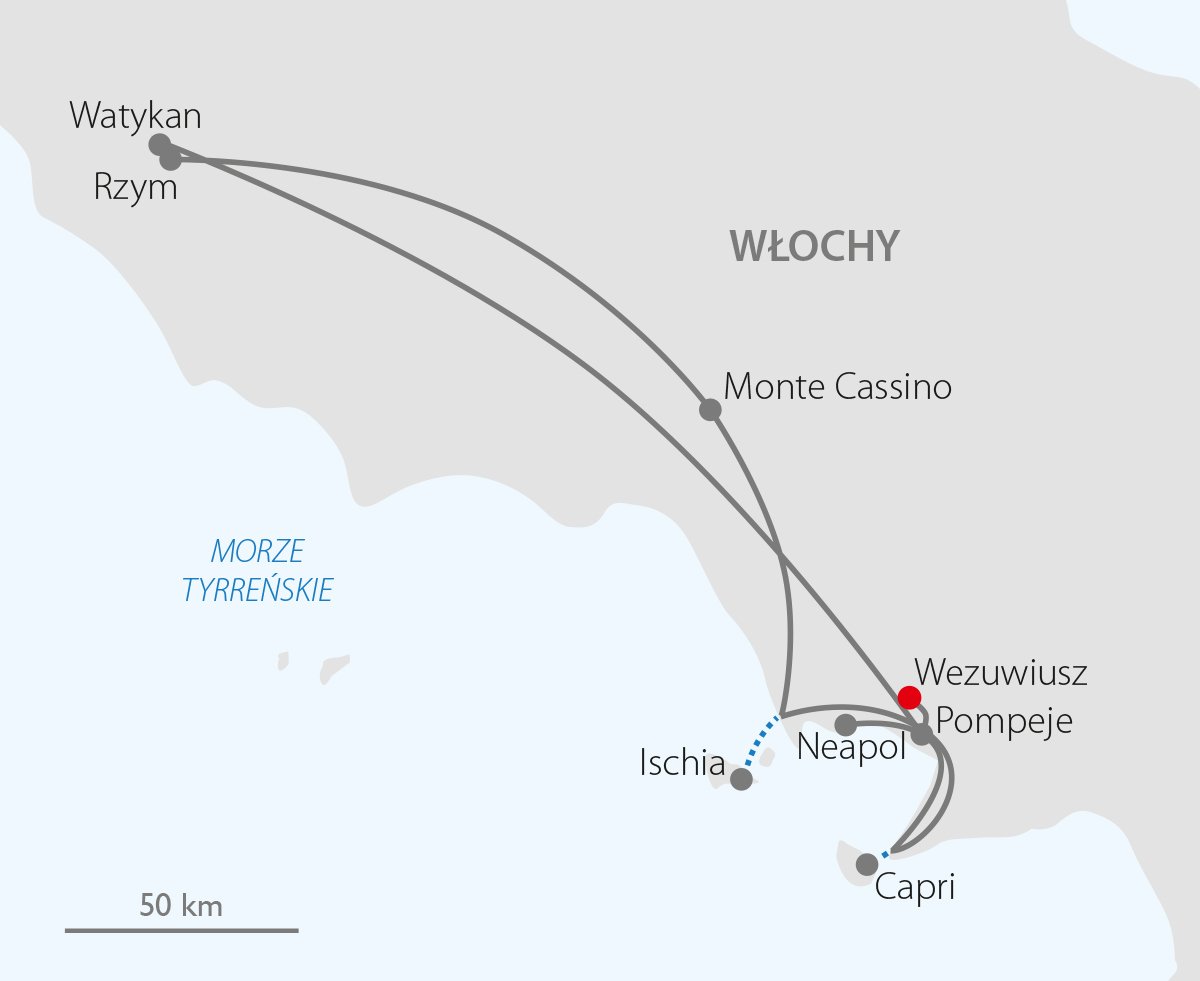 Jeżeli lubisz słońce, piękne widoki i włoski temperament to ta wycieczka jest dla Ciebie! Od Wezuwiusza przez Watykan i Wieczne Miasto, na pełne życia, kolorowe południe Włoch, które mimo wielkiej popularności wśród turystów zachowało autentyczny charakter. W programie są dwie wyspy: legendarna Capri i piękna zielona Ischia, a także niesamowity Neapol – pełne zanurzenie w atmosferze włoskiego „mezzogiorno”. Warto przedłużyć wakacje o dodatkowy tydzień pobytu w wybranym hotelu w Kalabrii. Trasa we Włoszech: ok. 1300 km.