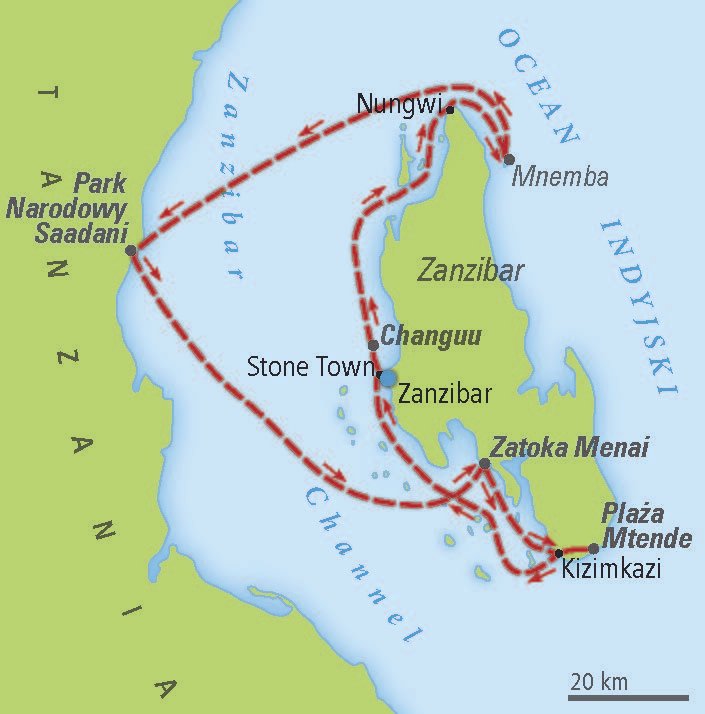 Śniadanie. Rejs po pięknej ZATOCE MENAI. Fakultatywnie, dla osób chętnych (za dodatkową opłatą na miejscu): zejście na ląd i przejazd do Rezerwatu Jozani. Spacer naturalnym szlakiem przez las pełen rzadkich gatunków egzotycznych ptaków, motyli i zagrożonych wyginięciem małp gereza ruda (Colobus badius) z charakterystycznymi, długimi włosami na głowie. Jest to jedno z niewielu miejsc, gdzie można je spotkać. Las ma charakter tropikalny ze względu na bujną roślinność i dzięki utrzymującej się w nim dużej wilgotności od morza, a także częstym opadom podczas pory deszczowej. Rosną tu palmy, figowce, mahoń, paprocie i drzewa namorzynowe. Przejazd do zjawiskowej PLAŻY MTENDE. Czas wolny, obiad. Powrót na katamaran, kolacja i nocleg (czas rejsu ok. 5 godz.).