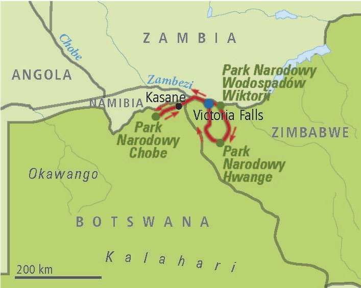 Śniadanie. Przejazd do Victoria Falls. Postój na lunch w Victoria Falls. Dalej przejazd do KASANE i przekroczenie granicy z Botswaną. Położone nad rzeką Chobe, jest bazą wypadową dla wszystkich odwiedzjących najbardziej znany z parków narodowych Botswany: Park Narodowy Chobe, będący największym skupiskiem słoni na świecie! Te olbrzymy często można spotkać w niewielkiej odległości od granicy miasta. Na drodze dojazdowej należy zachować szczególną ostrożność, gdyż te ogromne stada często przechodzą nawet przez główną drogę. Zakwaterowanie w lodży, kolacja i nocleg.